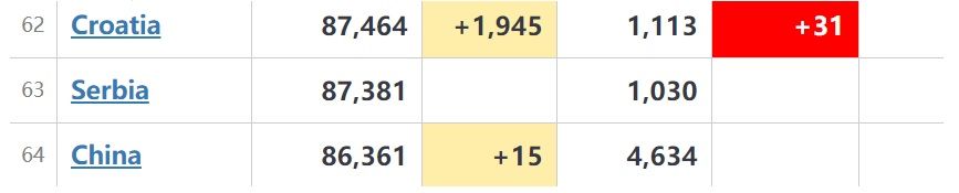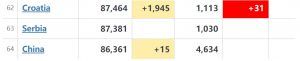 S obzirom na posljednji rast slučajeva zbog drugog vala, Hrvatska je očekivano premašila brojku od 87000 slučajeva, te je time čak premašila i Kinu, gdje je pandemija počela.
