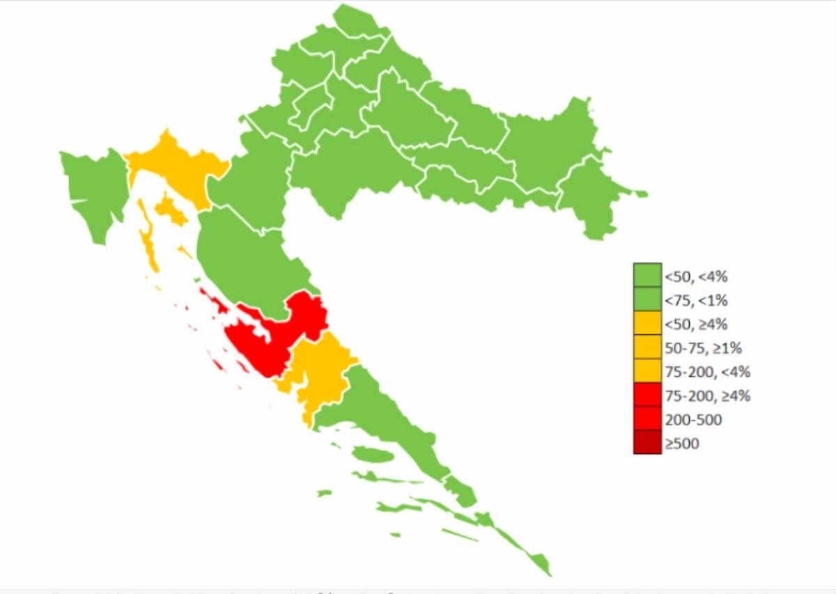 Sličnu kartu (slika gore) objavio je prije dva dana Hrvatski zavod za javno zdravstvo. Na njoj vidimo da je Zadarska županija crvene boje, odnosno da joj incidencija (broj novih slučajeva na 100.000 stanovnika) iznosi između 75 i 500, dok su ostali dijelovi obale većinom u zelenoj boji (incidencija manja od 75). Jedino su Primorsko-goranska i Šibensko-kninska županija žute boje (incidencija 50-200).