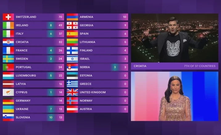 Glasovi publike su: Švicarska 1, Švedska 2, Armenija 3, Estonija 4, Irska 5, Francuska 6, Italija 7, Ukrajina 8, Slovenija 10 i Srbija 12.