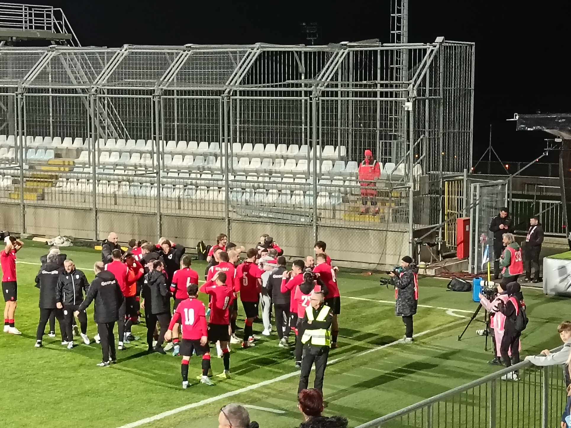 U završnici, Hrvatska je krenula na sve ili ništa. Pritisak domaćina bio je nevjerojatan, a šanse su se nizale. U 88. minuti Vušković je glavom zaprijetio iz blizine, no gruzijski vratar je obranio. Lopta se odbila do Hrgovića, koji je iz daljine pucao pored gola. Kada se činilo da je sve gotovo, u drugoj minuti sudačke nadoknade Marin Šotiček donosi novi trenutak nade. Nakon što je Beljo spustio visoku loptu u kazneni prostor, Šotiček ju je primio, okrenuo se i pogodio za 3:2. Rujevica je eruptirala od oduševljenja.