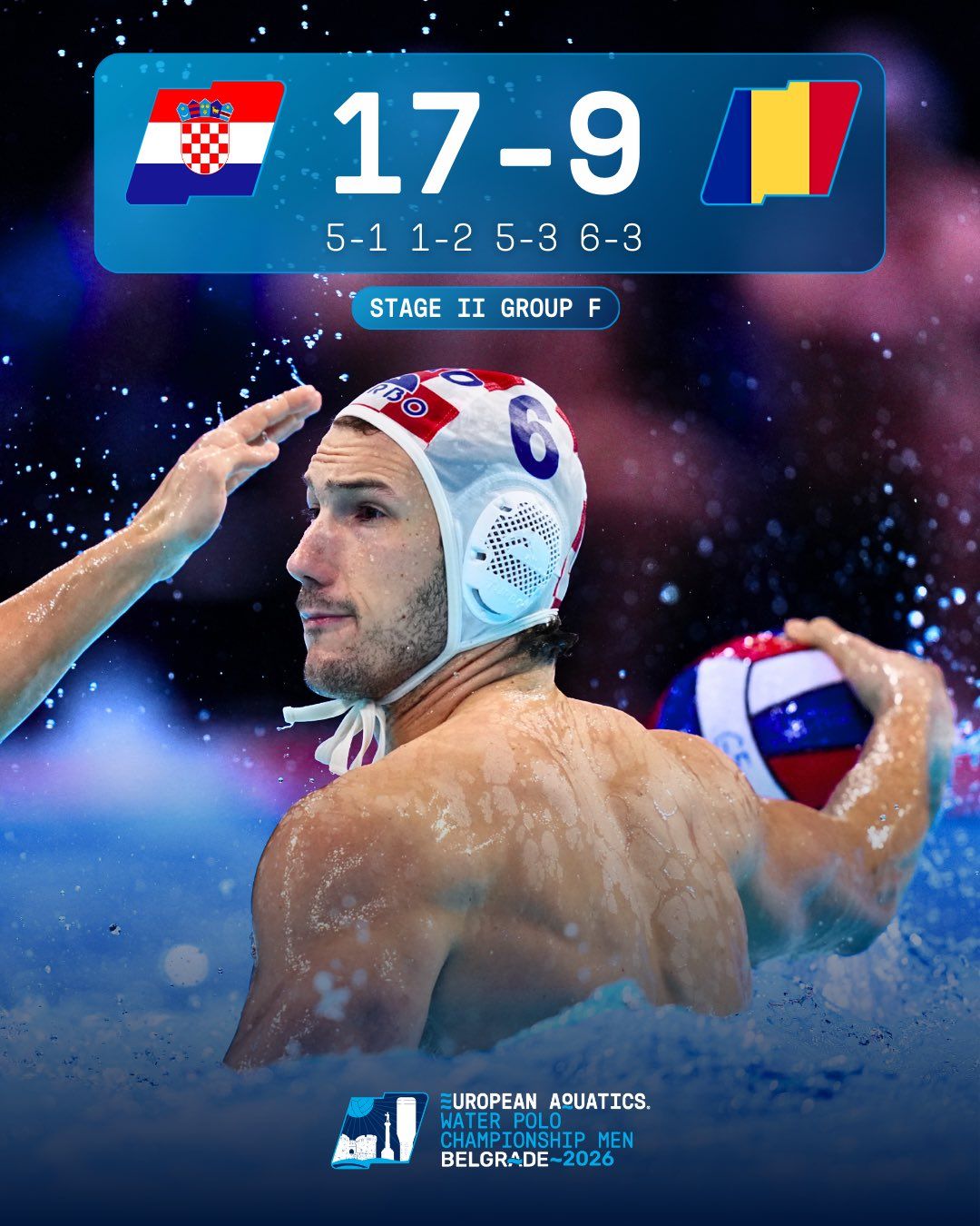 Hrvatka muška vaterpolska reprezentacija u susretu je 1. kola skupine F drugog kruga natjecanja na Europskom prvenstvu u Beogradu rutinski svladala Rumunjsku sa 17:9 (5:1, 1:2, 5:3, 6:3).