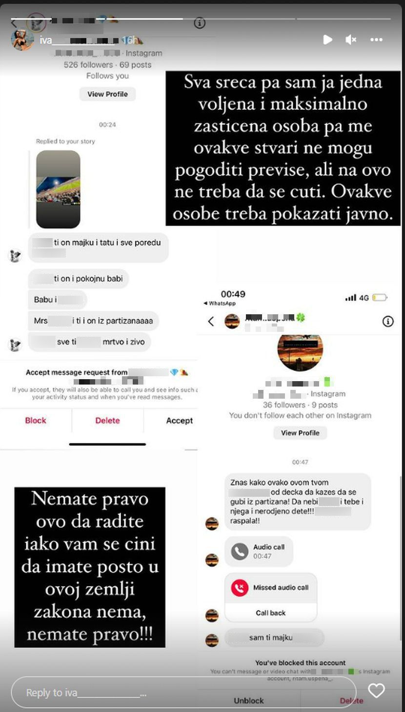 – Srećom, ja sam voljena i maksimalno zaštićena osoba pa me ovakve stvari ne mogu previše pogoditi, ali o ovome ne treba šutjeti. Takve osobe treba javno prikazati. Nemaš pravo na to, iako ti se čini, budući u ovoj zemlji nema zakona, nemaš pravo – napisala je Iva, a zatim se osvrnula na navijače koji iskreno bodre igrače Partizana.