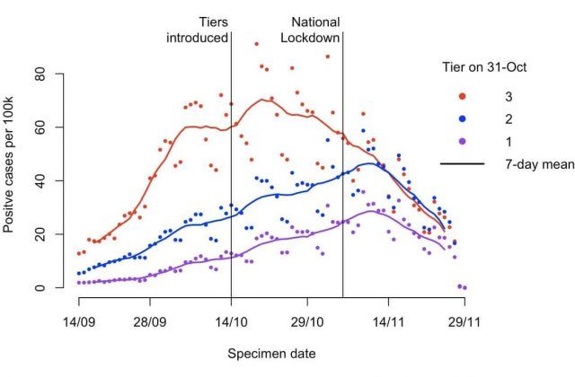 Od 14.10. do 6.11. pratilo se tijekom 3 tjedna kako koje od tog sustava mjera utječu na širenje drugog vala pandemije. Vidimo da mjere iz “Tier 1” nisu bile dovoljne i zaraza se nastavila širiti i rasti; na žalost, isto se pokazalo i za mjere iz “Tier 2”. Tek su mjere u područjima “Tier 3” pokazale da je u prva dva tjedna nakon njihova uvođenja širenje zauzdano i krivulja zaravnjena, a u trećem je tjednu počeo i vrlo blagi pad.