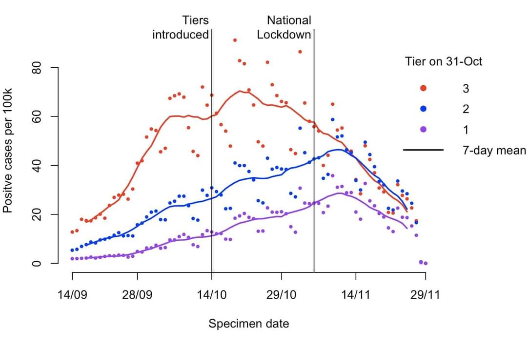 Zbog toga Vlada uvodi za Englesku lockdown, kako bi brojke značajno spustila u područjima “Tier 1”, “Tier 2” i “Tier 3”. Već 10-ak dana nakon uvođenja lockdowna, vidi se značajan i snažan pad incidencije u svim područjima Engleske.