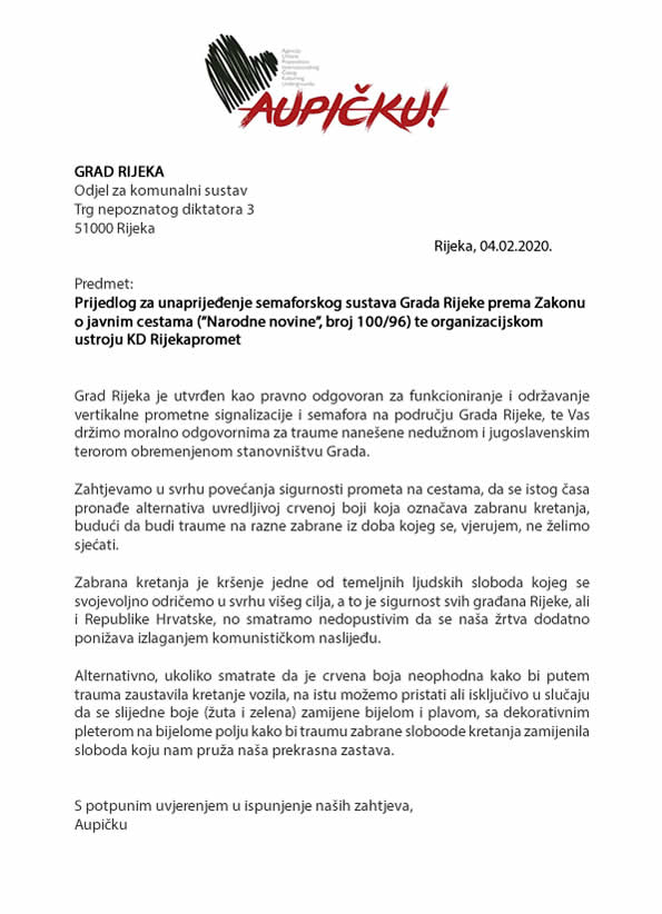 Inicijativa ‘Aupičku’ koja je za Valentinovo najavila akciju ‘Brisanja Jugoslavije iz kolektivnog sjećanja’ uputila je službeni dopis odjelu za komunalni sustav Grada Rijeke zahtijevajući da se, Prema Zakonu o javnim cestama (“Narodne novine”, broj 100/96) te organizacijskom ustroju KD Rijekapromet , ukine crveno svijetlo na semaforima u Gradu, ali i čitavoj Republici Hrvatskoj.