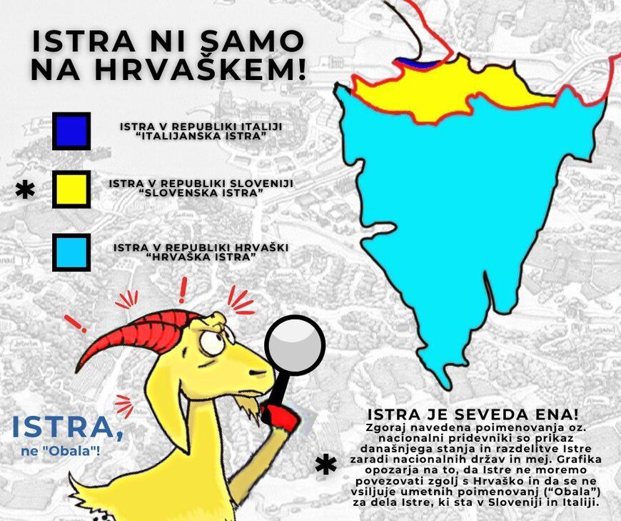 Zbog toga je grupa slovenskih Istrijana odlučila putem jedne Facebook grupe podsjetiti svoje sugrađane da Istra nije samo u Republici Hrvatskoj, te da se primorski dio Slovenije ne smije nazivati “Obala”, već jednostavno Istra, kako piše na Istra.hr.