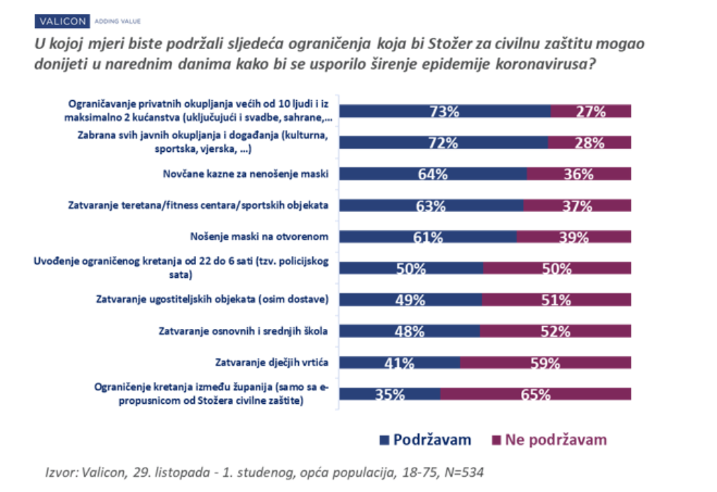 U posljednjih mjesec dana osjetno se promijenio stav građana prema mjerama koje se provode s ciljem obuzdavanja epidemije, sve više je onih koji postojeće mjere smatraju preblagim. Upitani o različitim mjerama koje bi nacionalni Stožer civilne zaštite mogao donijeti po uzoru na druge europske zemlje, građani u najvećoj mjeri podržavaju ograničenje privatnih okupljanja na 10 osoba, te zabranu javnih okupljanja