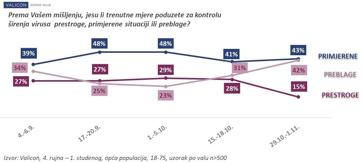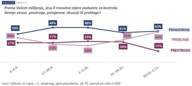 Kada je riječ o stavovima građana RH o postojećim i uvođenju novih mjera za sprječavanja širenja koronavirusa, redovito istraživanje agencije Valicon o temama vezanim uz pandemiju Covid-19, koje je provedeno od 29. listopada do 1. studenog na uzorku od n=534 ispitanika, otkriva da čak 42% građana smatra kako su mjere poduzete za kontrolu širenja virusa preblage. To predstavlja značajan zaokret u stavu u odnosu na razdoblje od prije 15 dana kad je takav stav imalo njih 31%, odnosno još izrazitije ako se gleda unazad mjesec dana kad je takav stav imalo samo 23% naših sugrađana. Ujedno se udio onih koji smatraju da su mjere prestroge u zadnja dva tjedna gotovo prepolovio – pad sa 28% na 15%, koliko ih ima prema ovom posljednjem istraživanju. Mišljenju da su postojeće mjere prestroge sklonije su mlađe osobe, pa tako u skupini od 18 do 29 godina svaki 4-ti smatra da su mjere prestroge, dok u skupini iznad 45 godina tako misli tek približno svaki 10-ti.