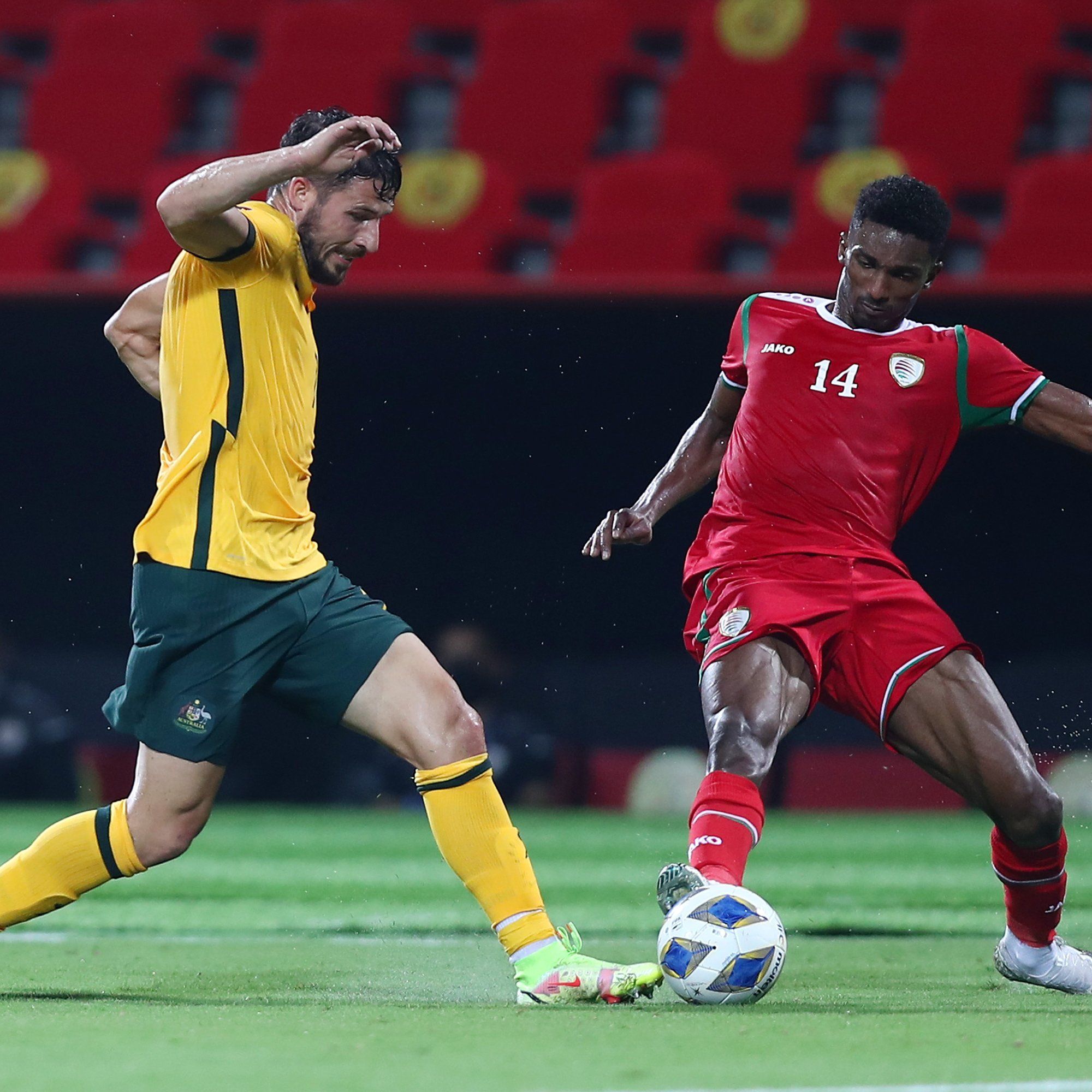 Gosti su poveli u 15. minuti golom Jamieja MacLarena iz jedanaesterca, a izjednačio je Abdulah Fawaz u 54. minuti. Deset minuta prije kraja Aaron Mooy je doveo Australiju u novo vodstvo, no Fawaz je u 89. minuti iz kaznenog udarca poravnao na 2:2.