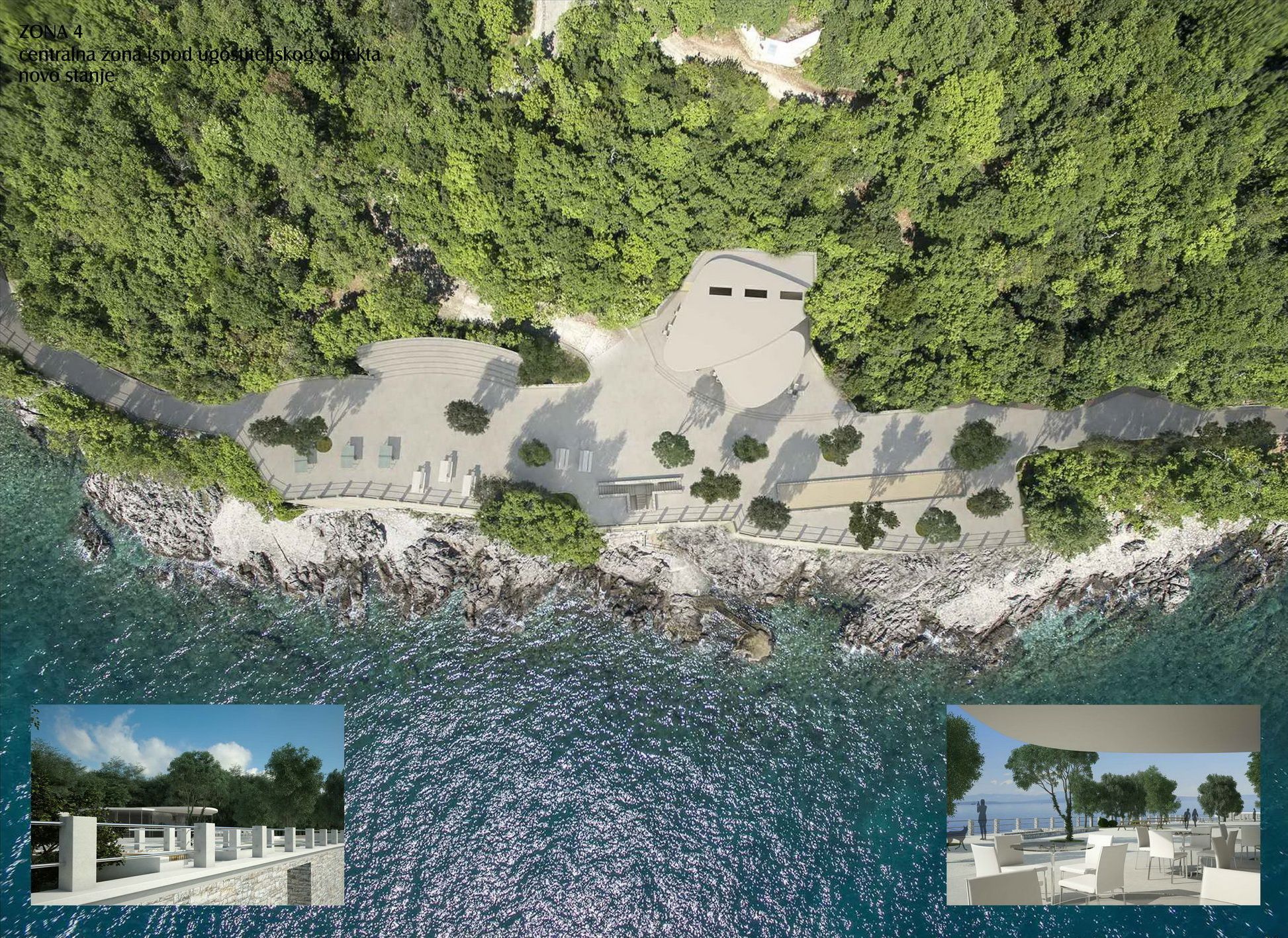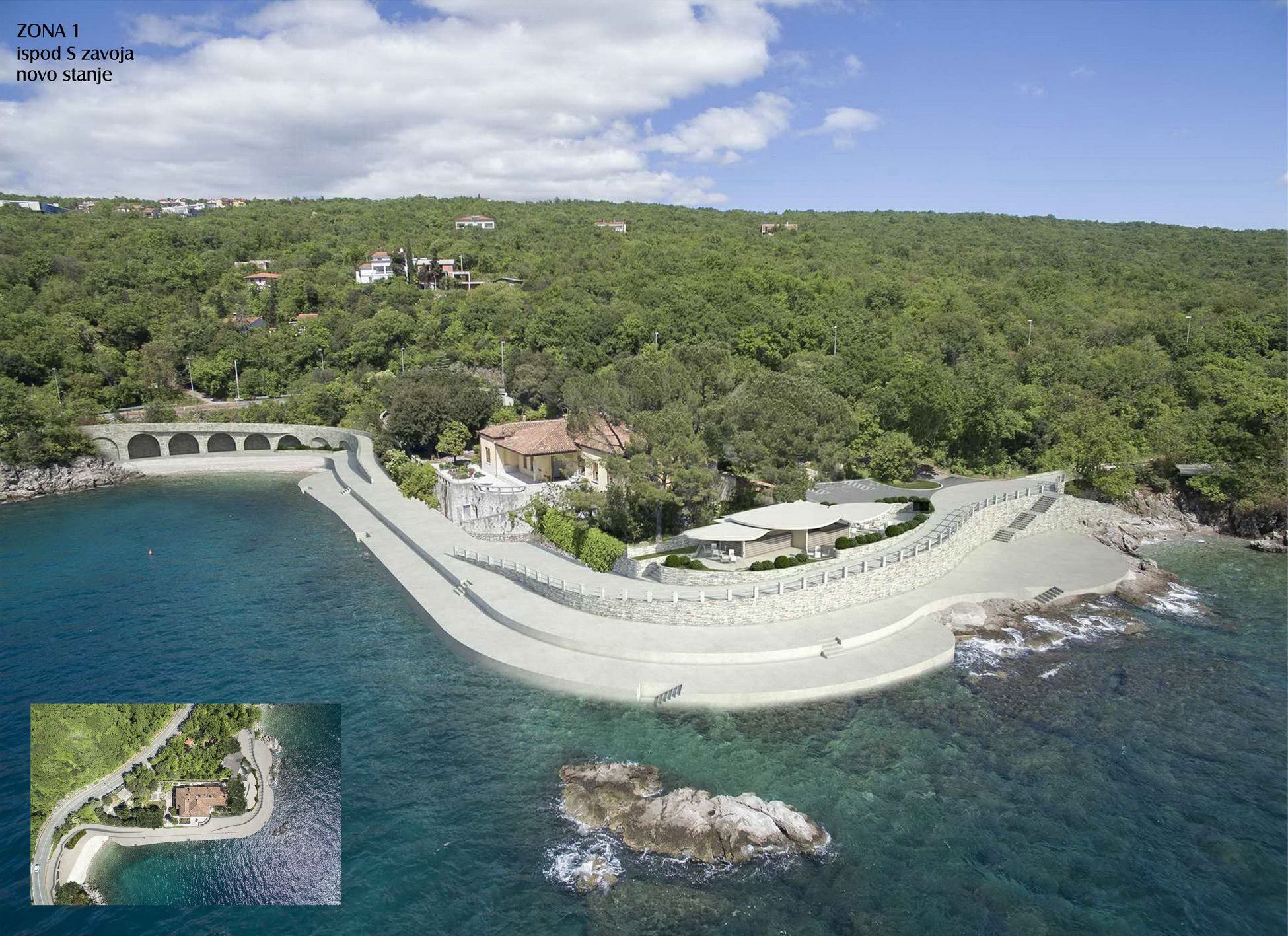 Dionica A je obuhvaća rekonstrukciju postojećeg Šetališta Milića Jardasa, od plaže nazvane „S zavoj“ do hotelskog kompleksa Costabella. Dionica B obuhvaća nastavak dionice A do plaže Bivio, a dionica C obuhvaća trasu obalne šetnice od plaže Bivio do plaže Ploče u podnožju kompleksa Bazena, gdje se nadovezuje na već izvedenu dionicu obalne šetnice.