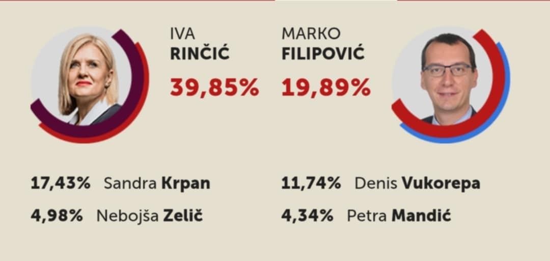 Stigle su izlazne ankete za Rijeku: Iva Rinčić 39,85%, Marko Filipović 19,89, Sandra Krpan 17,43, Denis Vukorepa 11,74, Nebvojša Zelić 4,98, Petra Mandić 4,34. Akcija mladih i partneri će imati većinu u novom Gradskom vijeću s 11 vijećnika (35,07 %). Slijedi SDP sa 7 vijećnika (22,23), pa HDZ s pet vijećnika (14,78 %), dok Nezavisna lista Marka Filipovića ima tri vijećnika (11,08 % glasova). Na kraju su Možemo! s tri vijećnika (9,5 %) i Most s dva vijećnika (6,63 %).