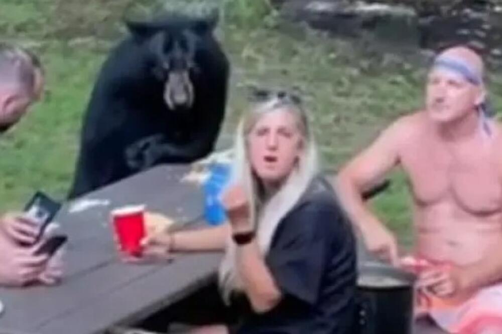 I sve je bilo u redu, dok veliki crni medvjed nije nonšalantno prišao ljudima i pridružio se zabavi naslonjen na stol.