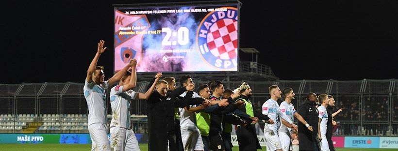Nogometaši Rijeke pobijedili su Hajduk 2:0 u utakmici 26. kola Hrvatski telekom Prve lige, te se vratili na drugo mjesto prvenstvene ljestvice preskočivši splitski sastav na drugom mjestu.