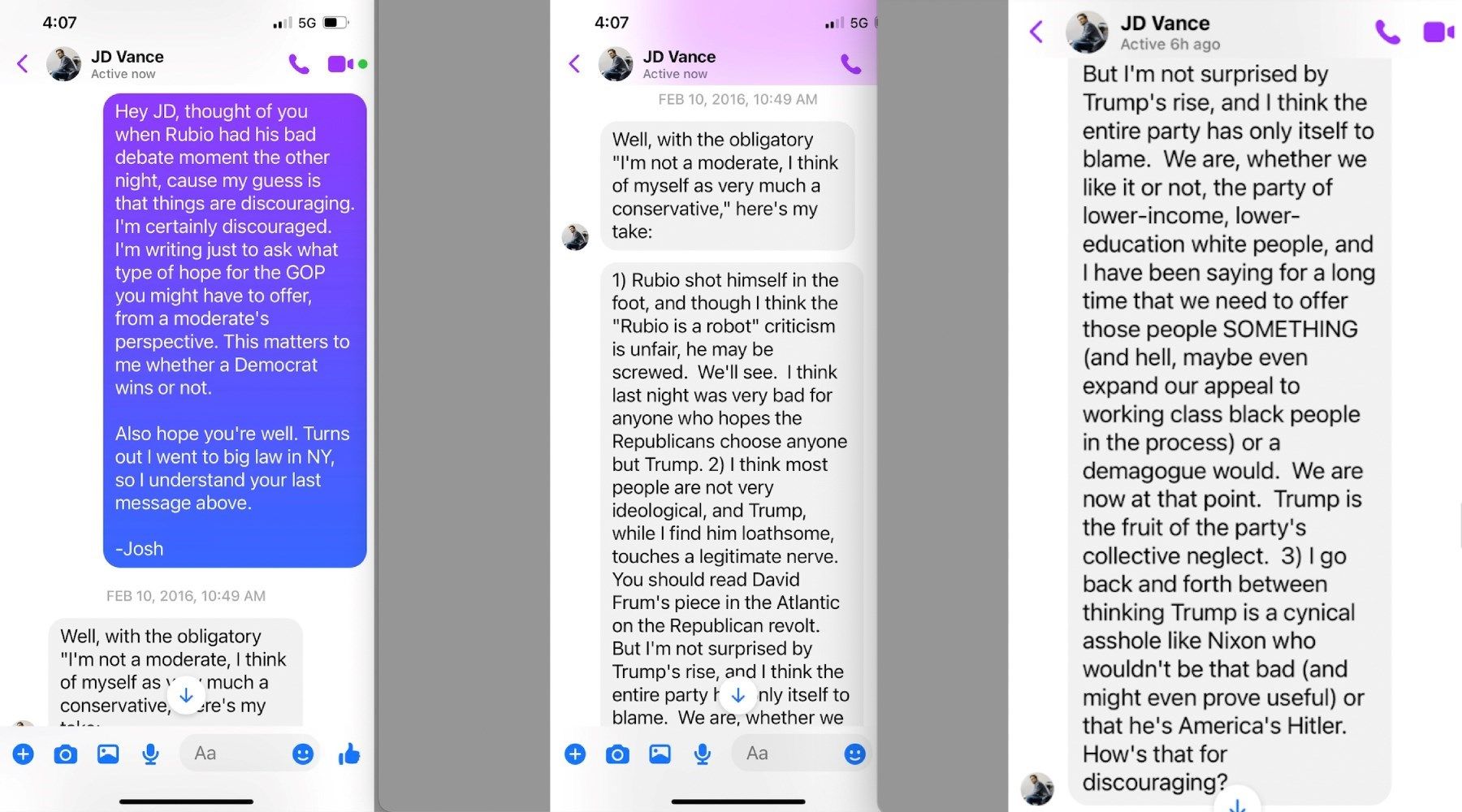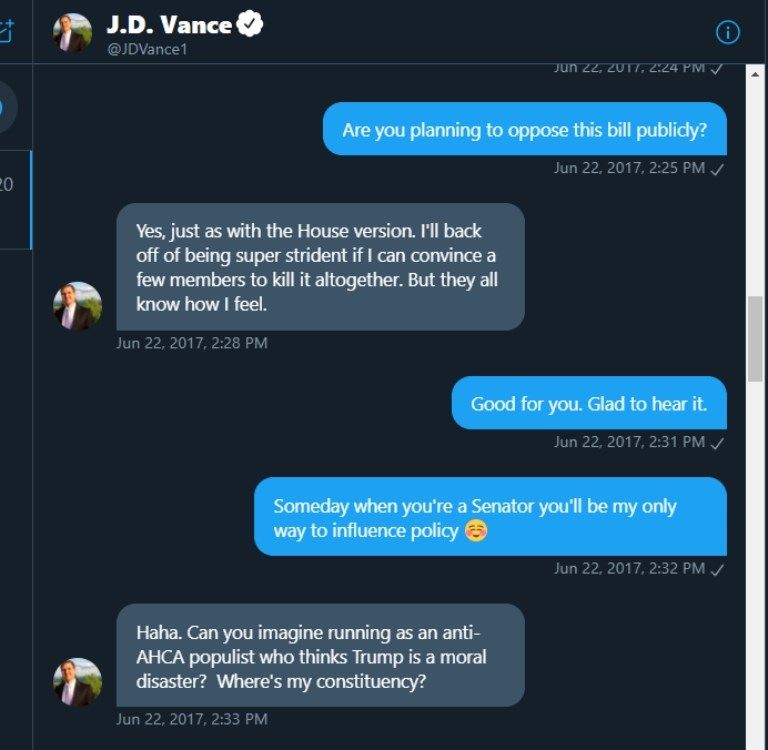 Još 2016. godine, kada je Trump bio predsjednički kandidat, Vance je privatno uspoređivao Trumpa s Hitlerom. U porukama bivšem cimeru s Yalea, koje je objavio Vice, napisao je: