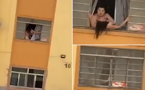 Disturbing moment pregnant woman tries to jump out second-floor window before being dragged back inside by her abusive husband in Brazil