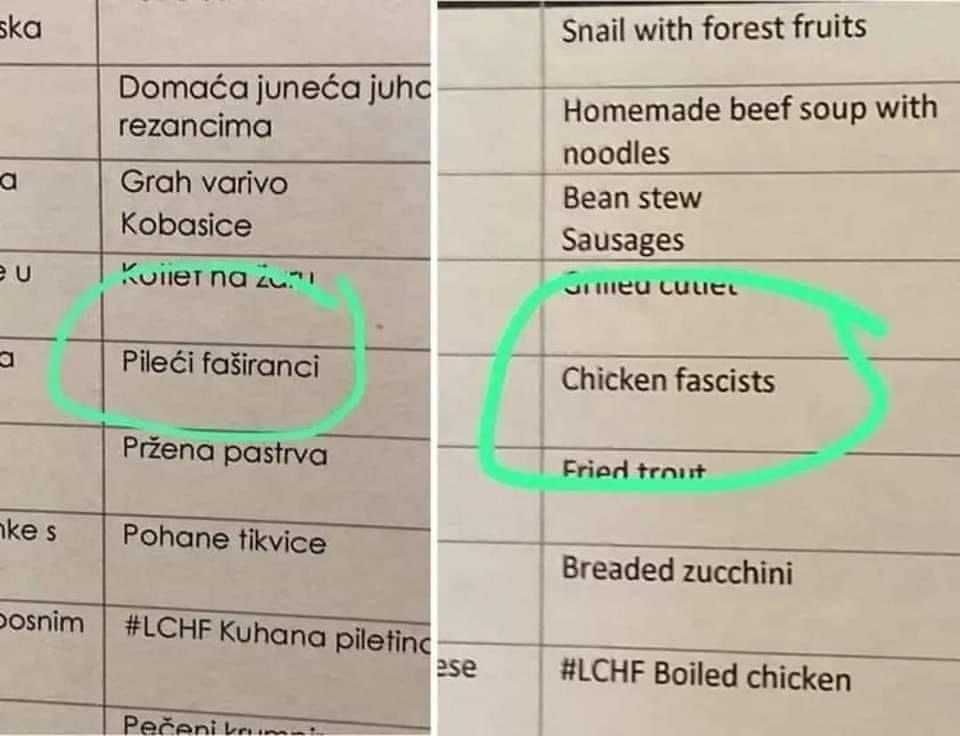 Home Mozaik Kada prevođenje krene po zlu: Totalitarni faširanci zabrinuli goste :-) Mozaik Kada prevođenje krene po zlu: Totalitarni faširanci zabrinuli goste :-) By dš - July 8, 2024 0 FacebookTwitterPinterestWhatsAppTelegram U restoranu na obali je pronađen novi specijalitet: “chicken fascist”! Pileći faširanci nikad nisu bili ovako autoritativni. 🍗👨✈️ Pitanje je sad: marširati do stola ili izbjegavati ovu totalitarnu deliciju? d50f7ffe 79f0 41b0 ac33 e7929611aea6
