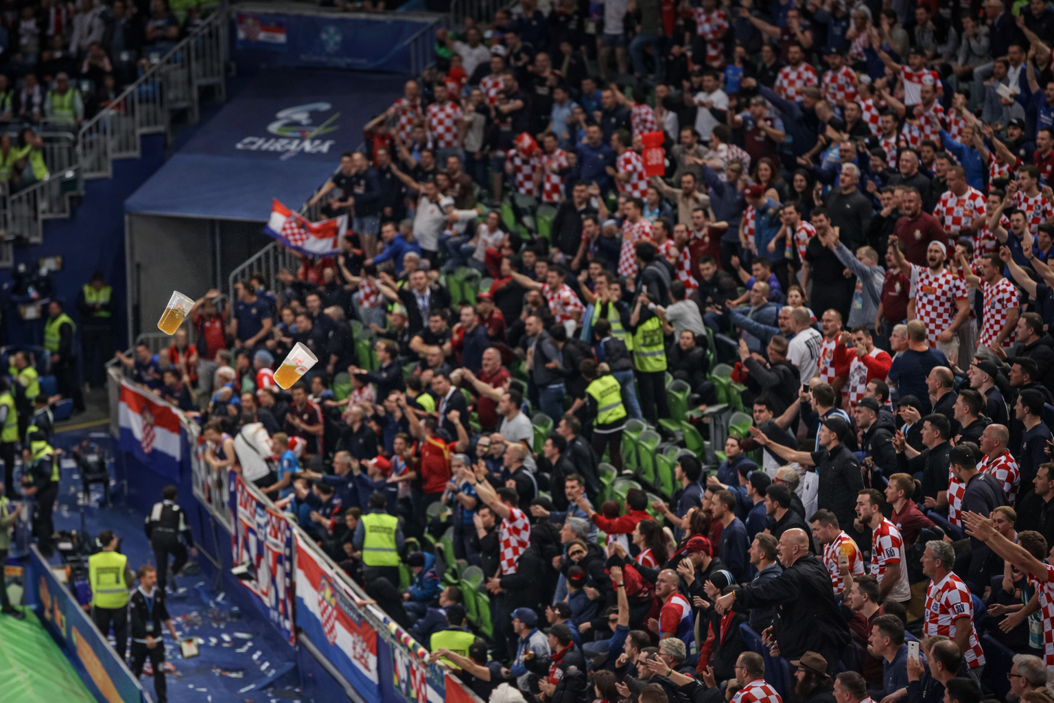 U drugom poluvremenu došlo je do kulminacije nezadovoljstva. Iz jednog sektora na gornjim tribinama prema parketu su bačene čaše s pivom, što je natjeralo suce da odmah zaustave igru. Iako nitko nije ozlijeđen, jedna čaša prošla je vrlo blizu sutkinje, što je izazvalo dodatnu uzbunu.