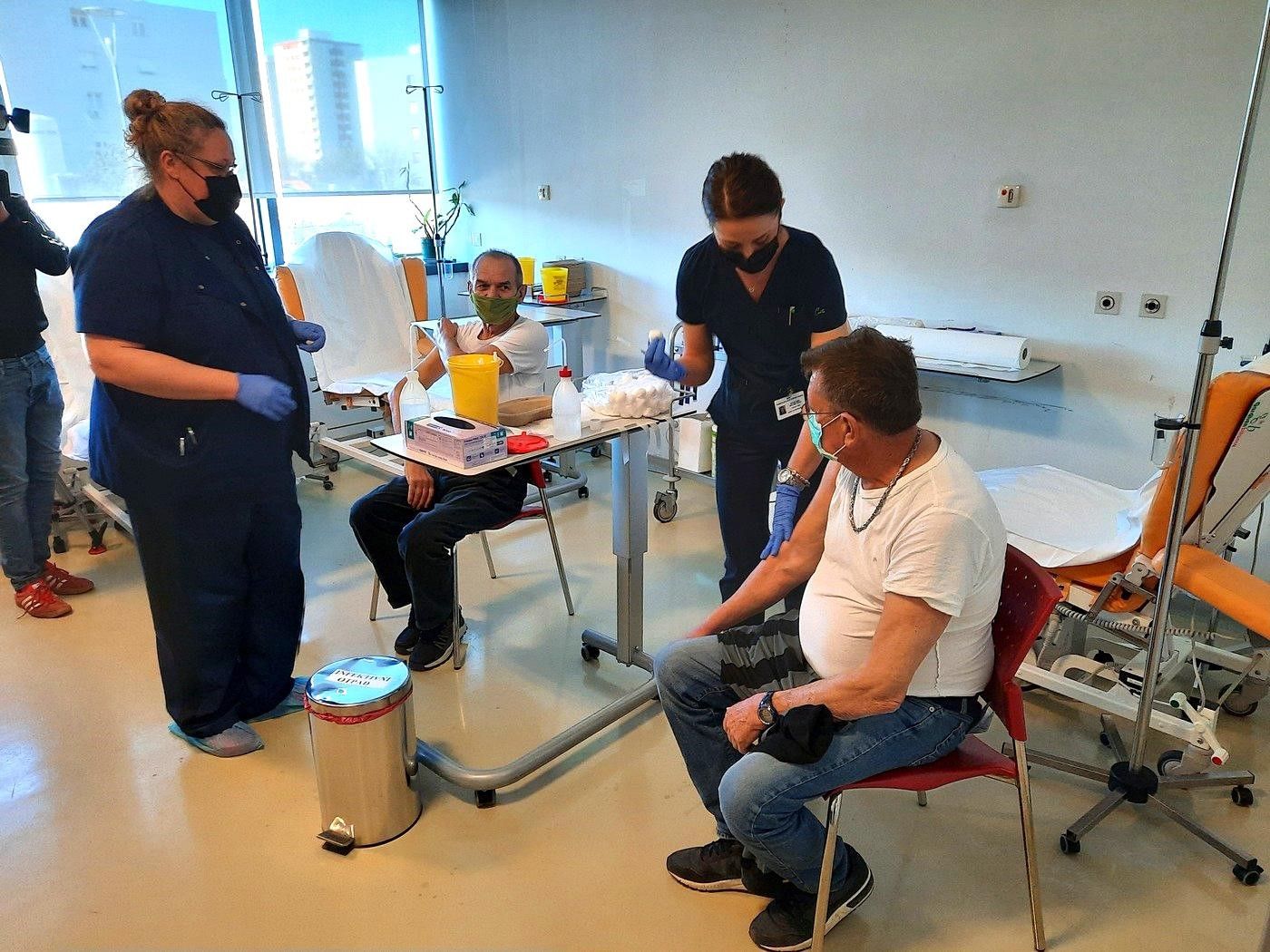 Podršku pacijentima i osoblju koje je sudjelovalo u cijepljenju dijaliziranih bolesnika iskazali su ravnatelj prof. Alen Ružić i prof. Sanjin Rački, pročelnik Zavoda za nefrologiju, dijalizu i transplantaciju bubrega KBC-a Rijeka.