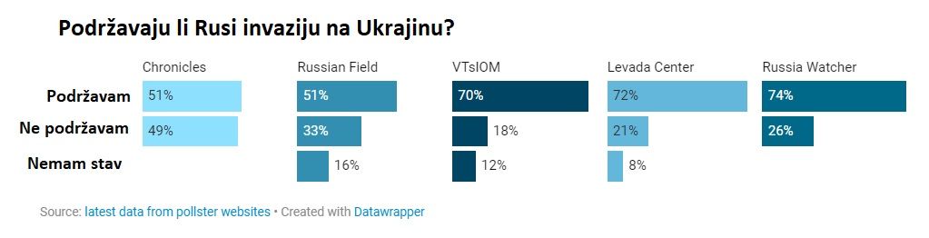 Projekt Chronicles procjenjuje podršku ratu na oko 30% koristeći slično ciljano ispitivanje. Sociolozi skupine izrađuju ankete znajući da je ruska kriminalizacija javnog antiratnog raspoloženja utjerala strah u mnoge ljude, rekao je Minyaylo.