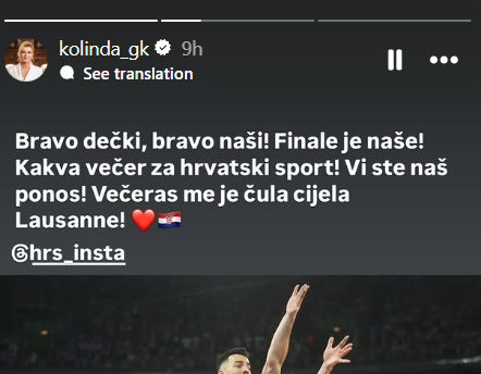 Bivša hrvatska predsjednica Kolinda Grabar-Kitarović nije krila oduševljenje nakon velike pobjede hrvatske rukometne reprezentacije nad Francuskom i prolaska u finale Svjetskog rukometnog prvenstva. Svojim emocijama podijelila se na društvenim mrežama, gdje je čestitala rukometašima uz riječi: “Bravo dečki, bravo naši! Finale je naše! Kakva večer za hrvatski sport! Vi ste naš ponos! Večeras me je čula cijela Luzana!”