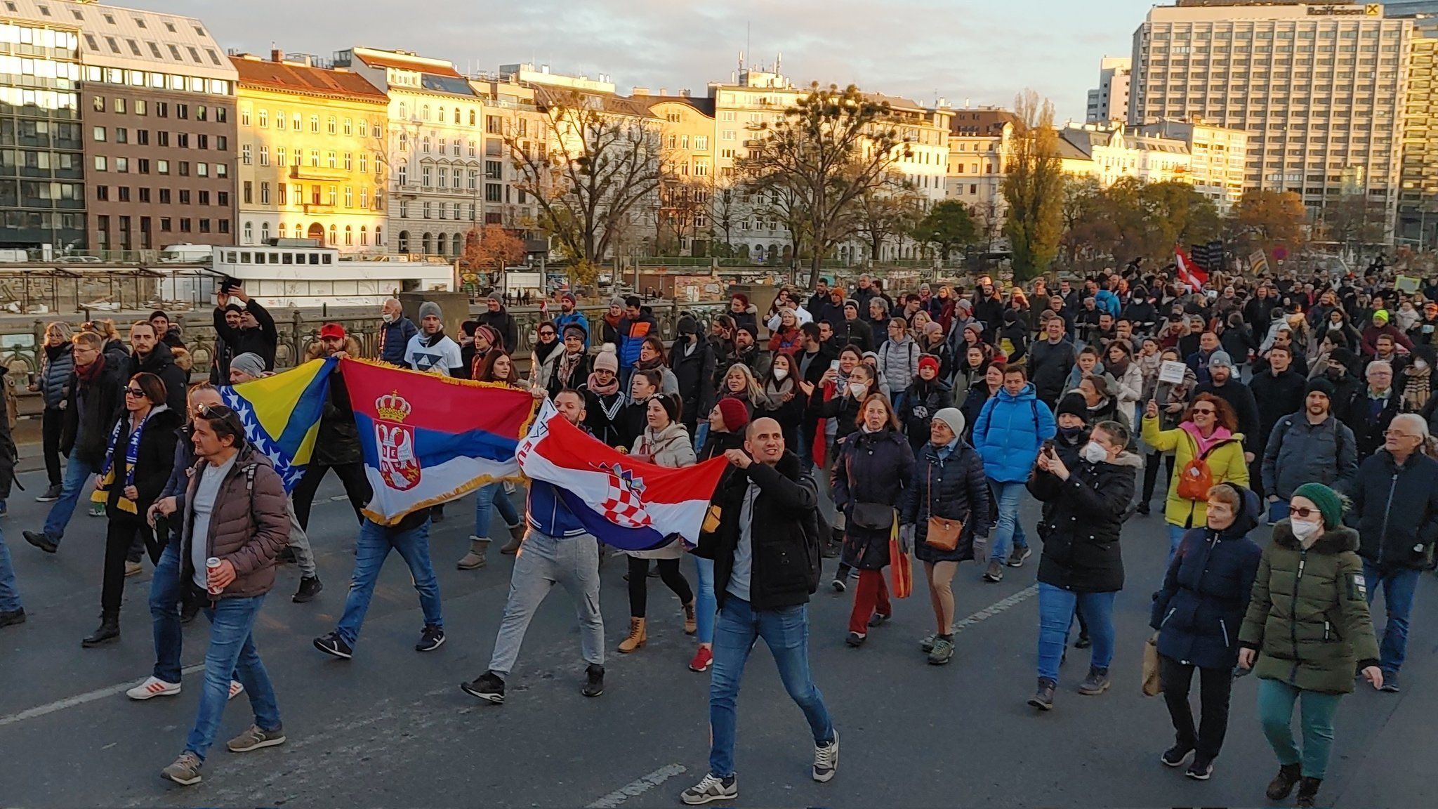 Prosvjed protiv covid potvrda i obaveznog cijepljenja održo se jučer i u Beču, gdje okupilo oko 35 tisuća prosvjednika.