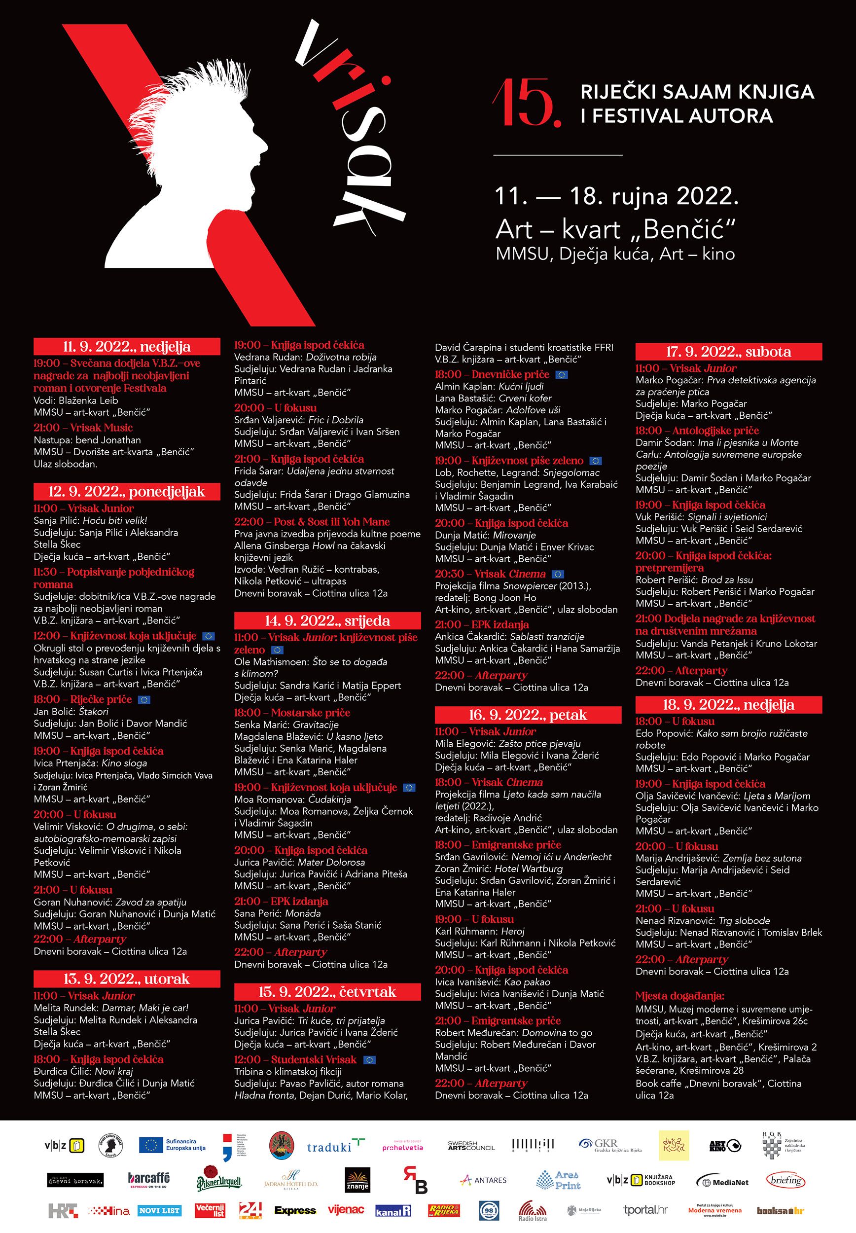 Program 15. Vriska nastavlja se od 12. do 18. rujna u art-kvartu „Benčić“, gdje posjetitelje čeka preko 40 književnih i kulturnih programa. Ulaz na sve programe je besplatan, a večernji razgovori i promocije moći će se pratiti i preko live stream na V.B.Z.-ovu YouTube kanalu i Facebook stranici.