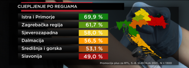 Gledano po regijama, za cijepljenje su najviše zainteresirani stanovnici Istre i Primorja – njih gotovo 70 posto (69,9 posto) namjerava primiti cjepivo. Slijede Zagreb i okolica sa 61,7 posto, sjeverozapadna Hrvatska s 58, Dalmacija s 56,5, te središnja i gorska Hrvatska s 53,1 posto. Najpodijeljeniji oko cijepljenja su Slavonci – 49 posto ih se želi cijepiti.