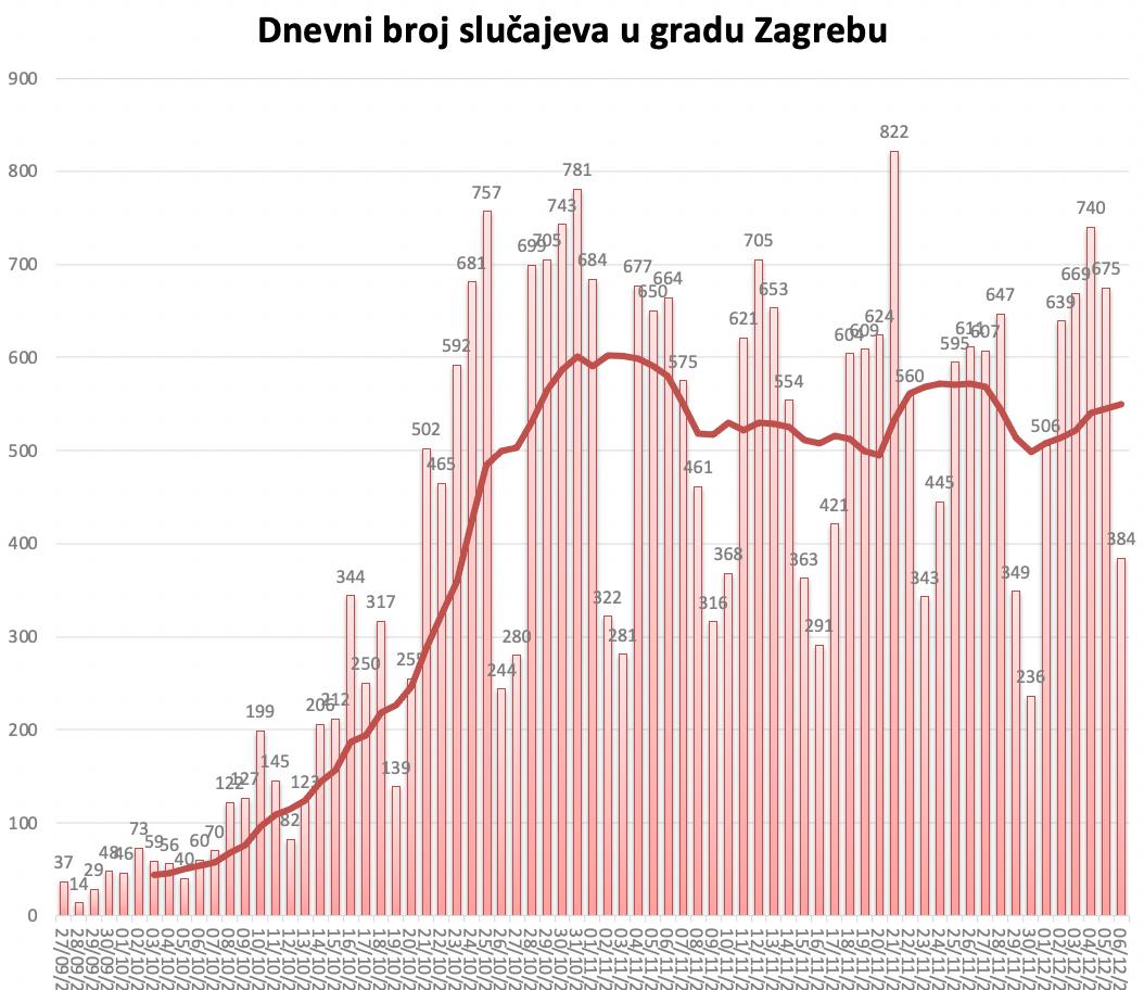 Kako KB Dubrava preuzima i višak pacijenata iz regije, to dodatno sugerira da se broj osoba koje trebaju hospitalizaciju u Zagrebu smanjuje, te da je trend blagog pada broja slučajeva koji u Zagrebu vidimo od početka studenog posljedica stvarnog pada broja zaraženih, a ne nedovoljnih kapaciteta za testiranje. Napominjem da je nesporno da je stvarni broj zaraženih uvijek je bitno veći od broja zaraženih koje potvrdimo testovima.