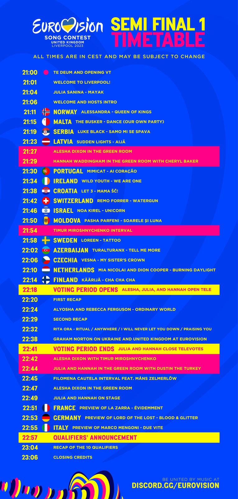 LET 3 na eurovizijsku pozornicu staje u 21:38 minuta. Prva polufinalna večer Eurosonga u Liverpoolu počinje u 21 sat, a niže možete vidjeti točan raspored događanja tijekom emisije.