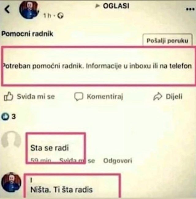 Home Mozaik Lik je na Facebooku tražio radnika, a njegov odgovor jednom kandidatu će... Mozaik Lik je na Facebooku tražio radnika, a njegov odgovor jednom kandidatu će vas nasmijati do suza By m s - March 20, 2025 0 FacebookTwitterPinterestWhatsAppTelegram 4d10be06 c2f9 4233 8763 2af1dc50c389 Ova rasprava u Facebook grupi prava je komedija apsurda! 🤣 e3b8aa06 c5cb 499c 8c4d 3bdf8a07293c
