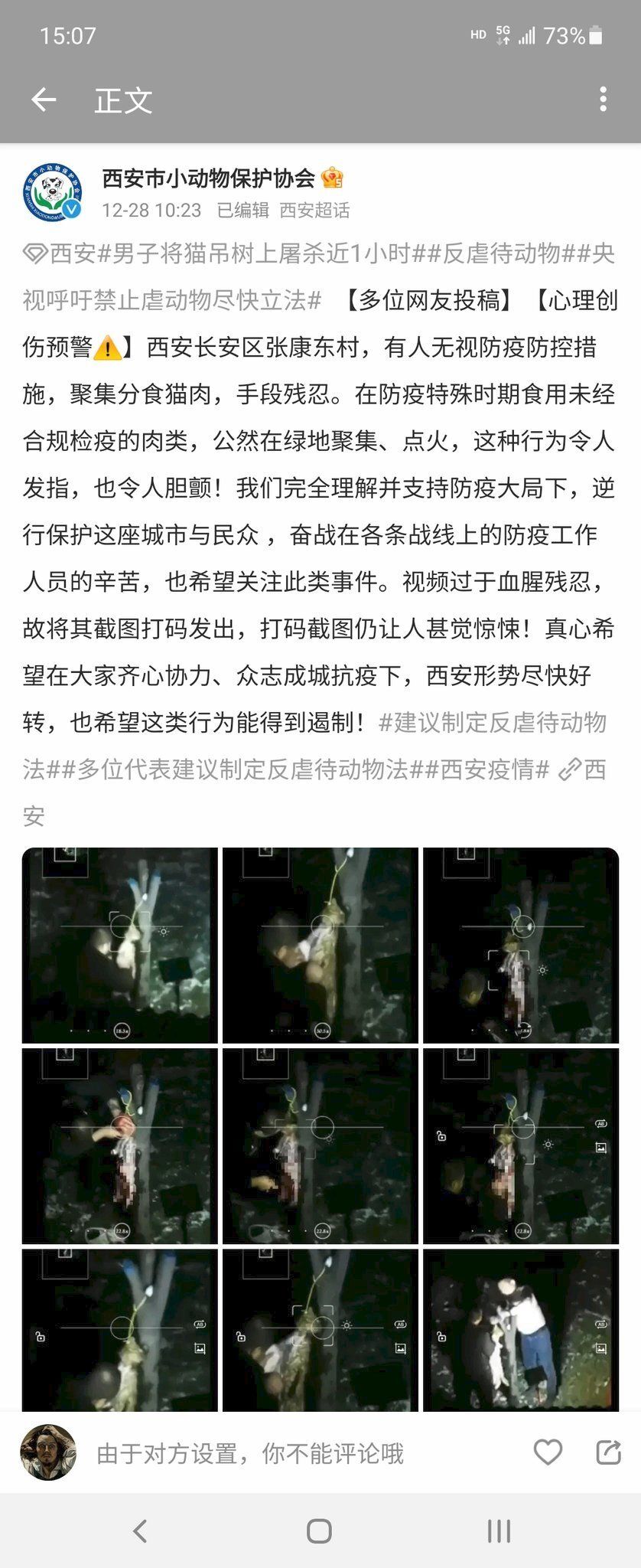 “Love Xi’an#Čovjek je objesio mačku o drvo i klao je skoro 1 sat##Okrutnost protiv životinja##CCTV poziva na donošenje zakona za zabranu klanja životinja što je prije moguće#[Objave mnogih internet forumaša ] [ Upozorenje o posebnom sadržaju] U Zhangkang East Villageu, Chang’an District, Xi’an, neki lokalni građani su ignorirali mjere prevencije i kontrole epidemije te su se okupili da jedu mačje meso okrutnim metodama.