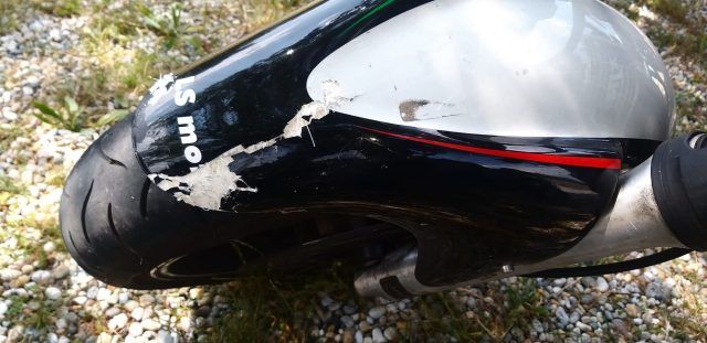 ‘Prijatelj i ja sa suprugama odlučimo otići do ispražnjenog Lokvarskog jezera, 1km prije skretanja za Fužine odjednom iz šume s lijeve strane ceste iskače .medo konkretnih dimenzija i zabija mi se u prednji kotač motora. Moja brzina kretanja bila turistička relax 50-60 kmh. Srećom, snalažljivošću uspijevam se održati na cesti. Prednji blatobran popucao je, a medo se malo povaljao po cesti i otrčao u šumu’, objavio je Slama na facebooku uz fotografiju oštećenog motora.