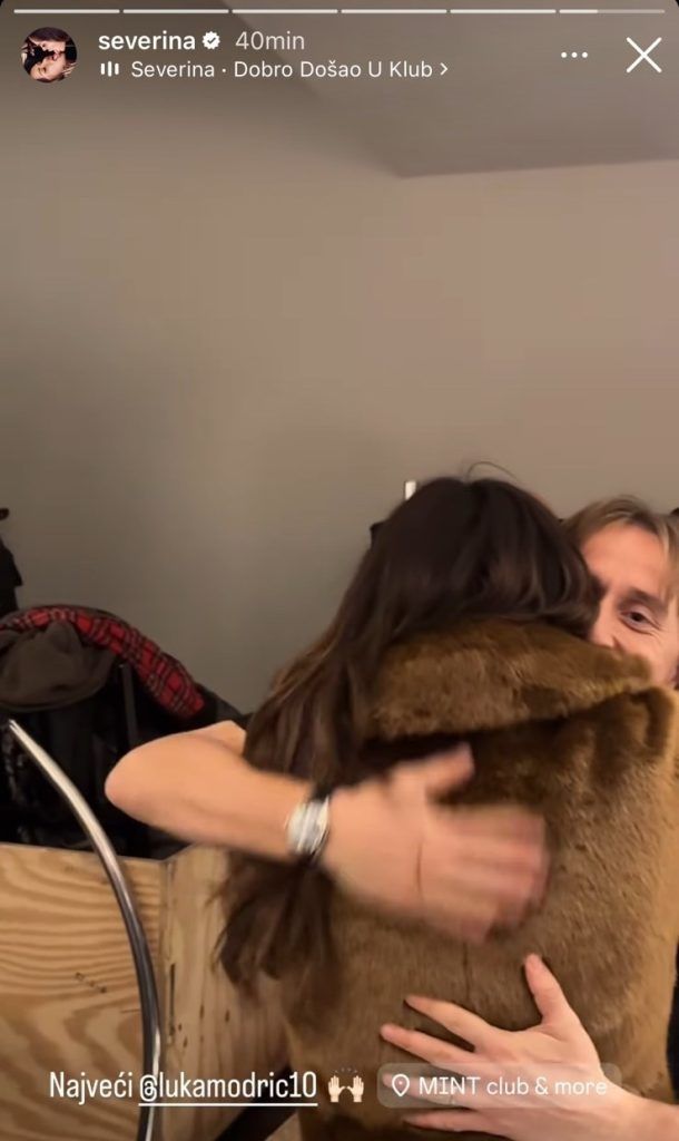 Seve je snimku susreta objavila na svom Instagram profilu. Na videu se vidi Modrić koji ulazi u prostoriju u kojoj je bila Seve, a njih dvoje se potom snažno grle te je nogometaš ljubi u obraz. Severina je video podvukla svojim hitom Dobrodošao u klub.