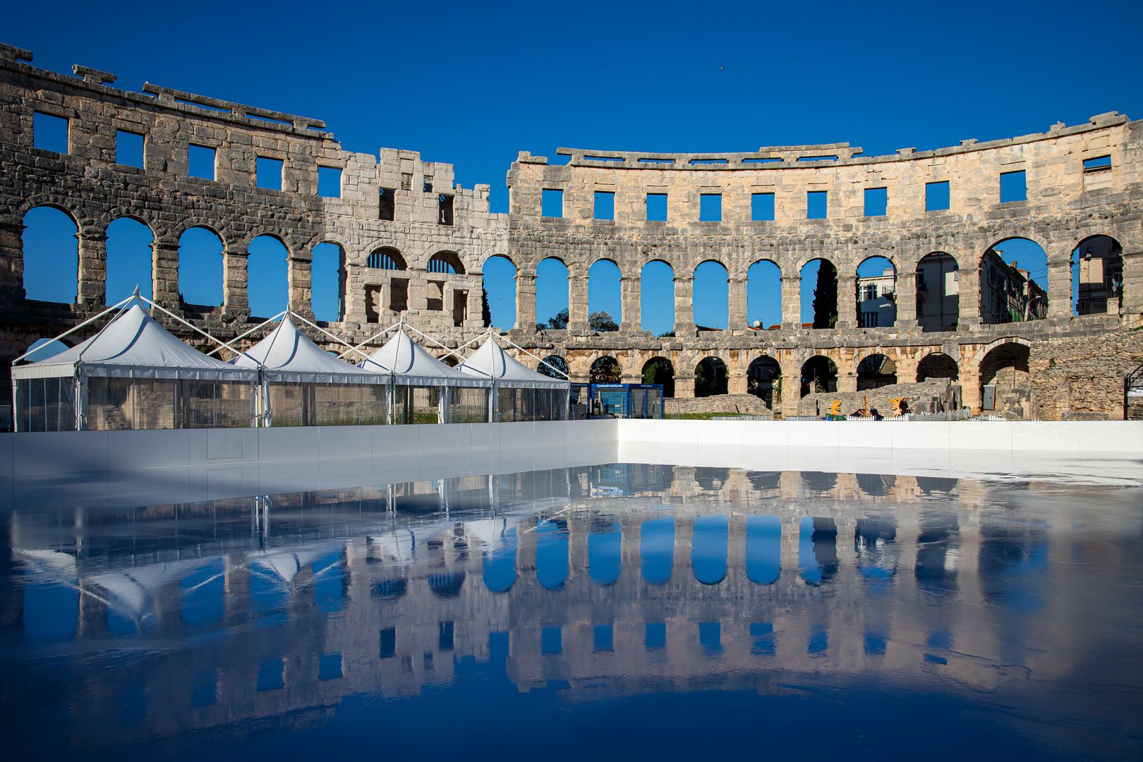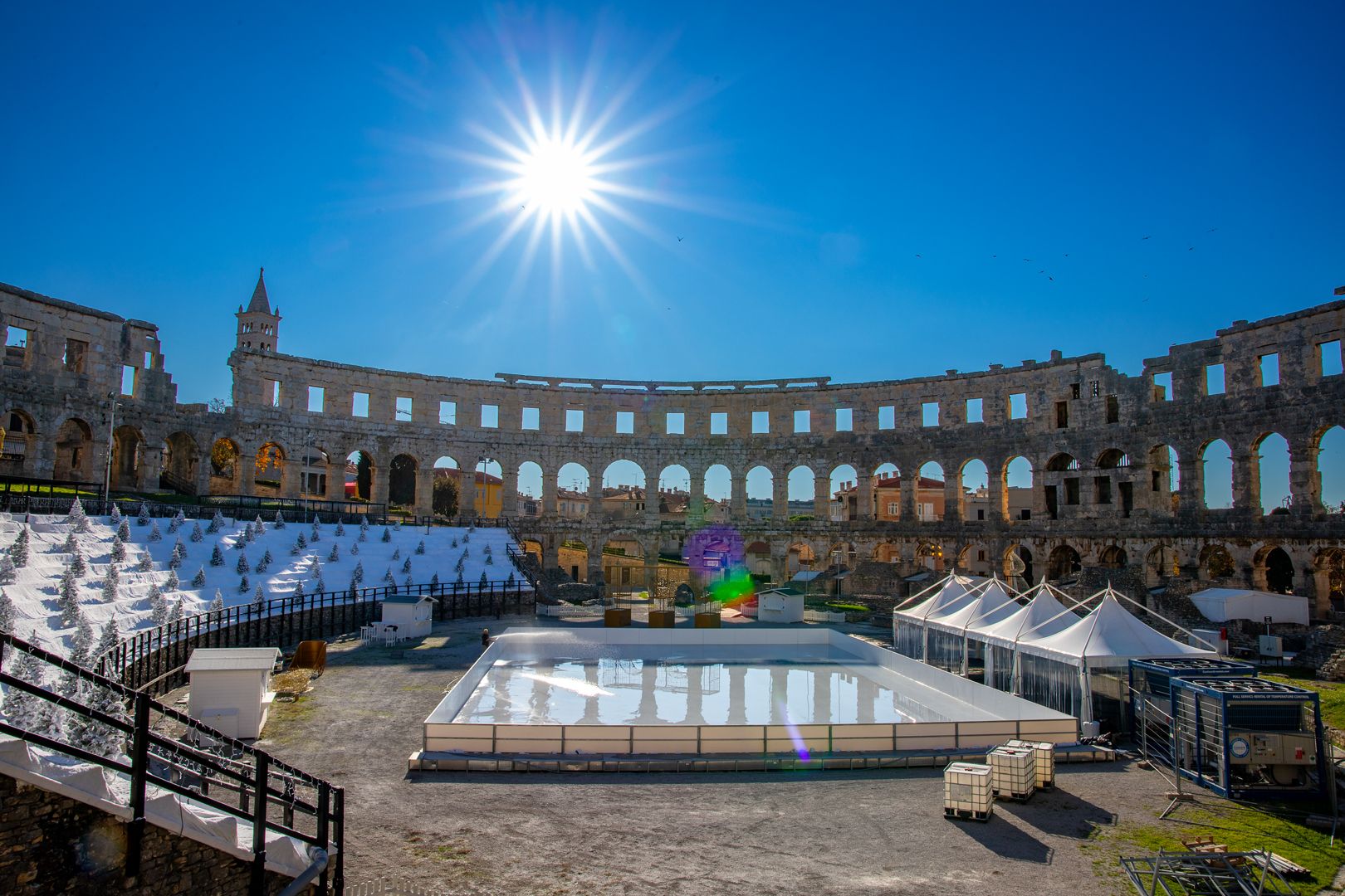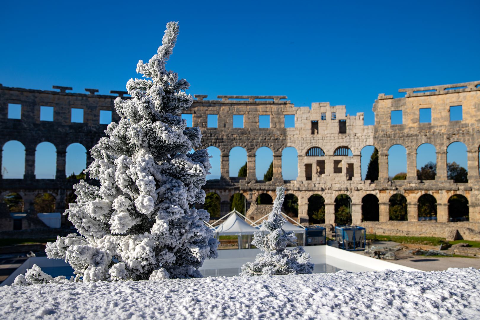 Osim klizališta, posjetitelji će moći uživati u fotografiranju uz postavljenu rimsku kočiju s konjima, koja dodatno oživljava povijesni duh Arene.