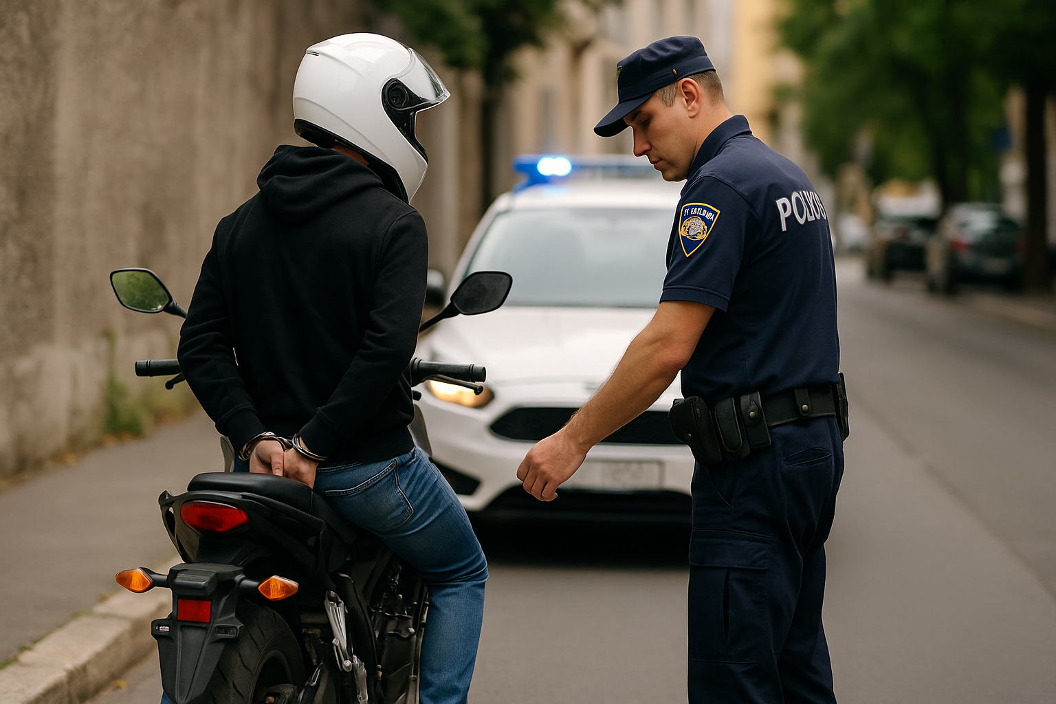 Zaustavljen je u Laginjinoj ulici, uhićen i priveden u I. policijsku postaju Rijeka. Utvrđeno je da je vozio bez vozačke dozvole, bez prometne dozvole, i da motocikl nije imao istaknute registracijske oznake. Vozilo mu je privremeno oduzeto.