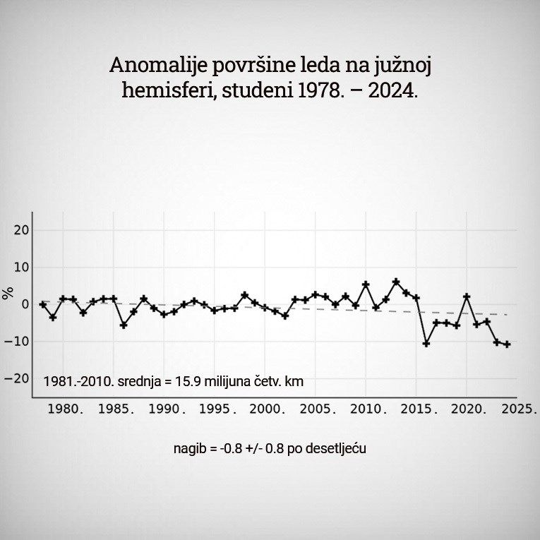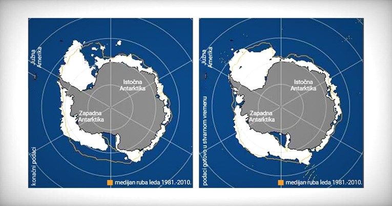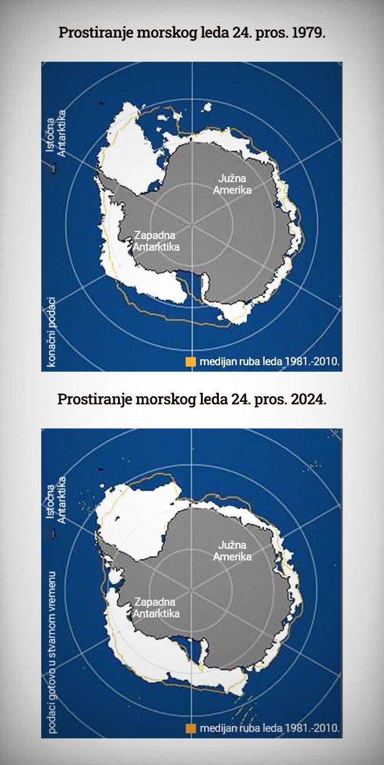 Posljednjih dana društvenim mrežama kruže usporedne karte površina pod ledom na Antarktici, koje navodno “dokazuju” da je globalno zatopljenje izmišljotina. Karte prikazuju stanje leda na 24. prosinca 1979. i 24. prosinca 2024., uz medijan ruba leda iz razdoblja 1981.–2010. Na prvi pogled, čini se da je leda danas jednako ili više nego prije 45 godina. Međutim, ovakva interpretacija podataka predstavlja tešku obmanu, prenosi index .hr.