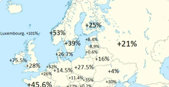 Percentage of Population increase from 1960 to 2020 by country in Europe (source: World Bank)