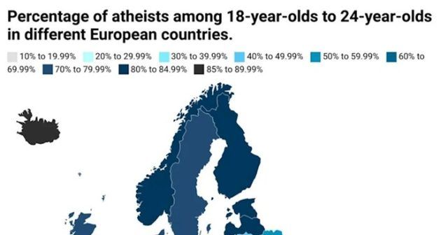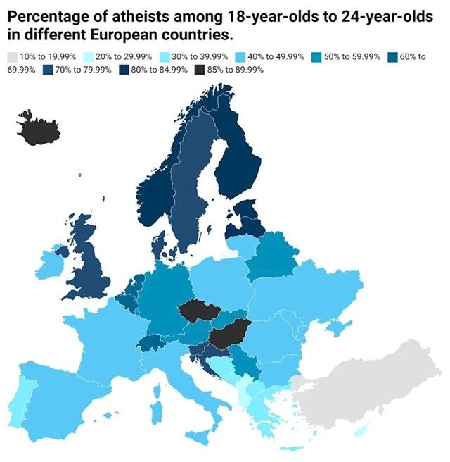 Home Mozaik Mapa pokazuje udio ateista kod mlađe populacije u pojedinim europskim državama, pogledajte... Mozaik Mapa pokazuje udio ateista kod mlađe populacije u pojedinim europskim državama, pogledajte RH By dš - March 20, 2023 0 FacebookTwitterPinterestWhatsAppTelegram Netko je na Redditu podijelio mapu koja prikazuje koliki je udio ateista kod mlađe populacije (18-24 godine) u pojedinim državama Europe. Podaci za Hrvatsku, inače izrazito katoličku zemlju, mogli bi vas prilično iznenaditi.