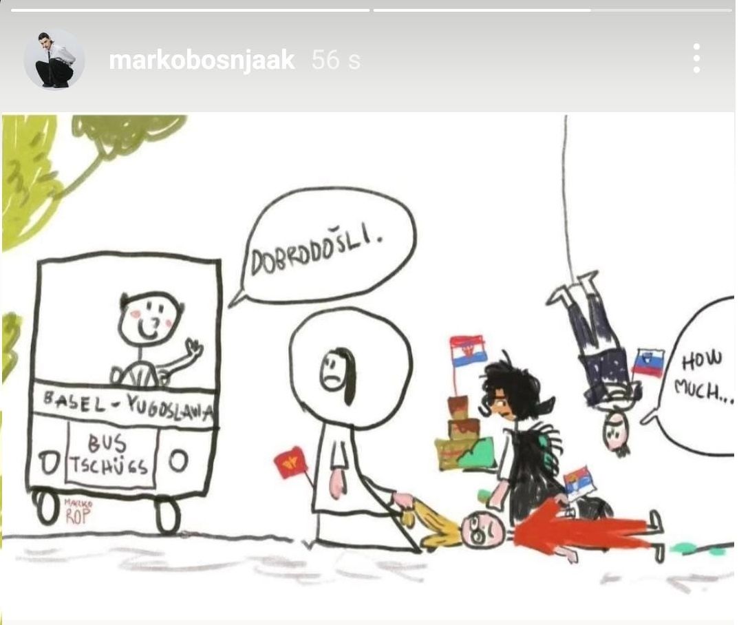 Na ilustraciji koju je objavio vidi se autobus s natpisom “Basel – Yugoslavia”, čiji vozač veselo maše uz riječi “dobrodošli”. Ispred autobusa prikazani su karikirani likovi svih ovogodišnjih predstavnika iz zemalja bivše Jugoslavije, svi s tužnim izrazima lica — simbolizirajući njihovo zajedničko ispadanje.