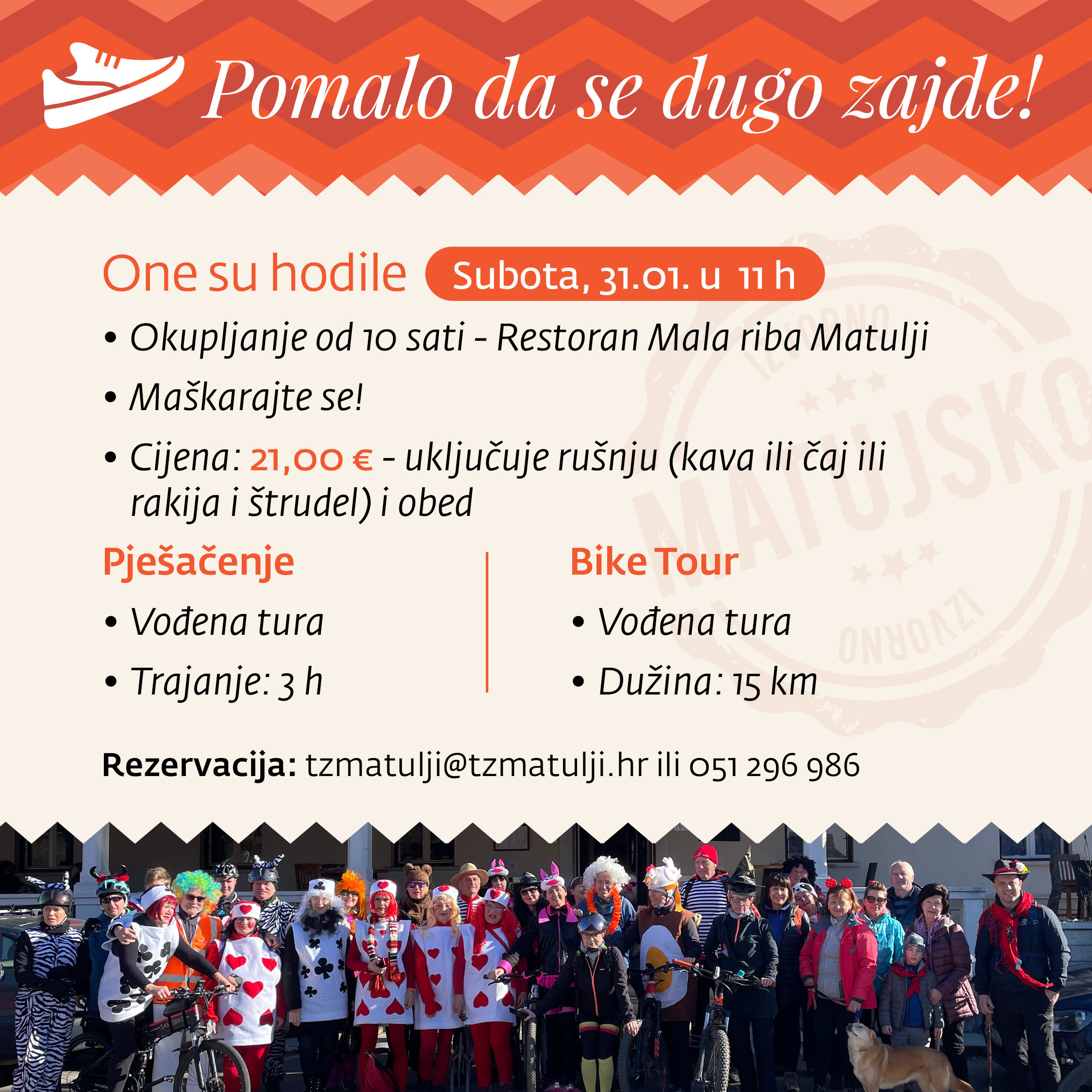 U subotu, 31. siječnja 2026., održava se pješačenje i biciklistička vožnja pod nazivom „One su hodile“. Okupljanje sudionika počinje u 10:00 sati ispred restorana Mala riba (Ul. 43. istarske divizije 22a, Matulji).