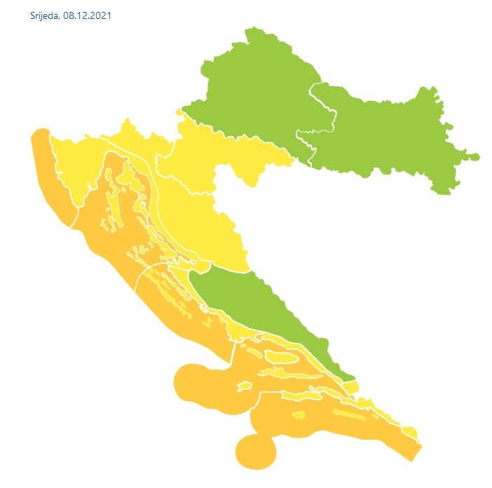 Prema prognozi DHMZ-a, sredinom dana sa zapada stiže naoblačenje, potom na sjevernom Jadranu kiša, a u gorskim područjima i susnježica i snijeg.