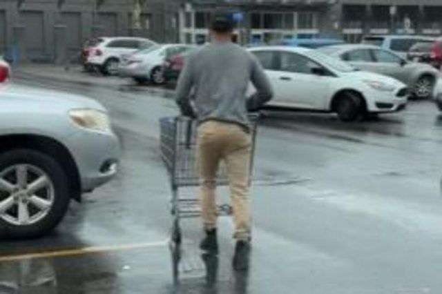 Snimka je snimljena na parkiralištu poznatog lanca trgovina mješovitom robom u Americi i Kanadi. Čovjek je imao dobro smišljen plan kako kući ponijeti torbe i vreće s namirnicama.