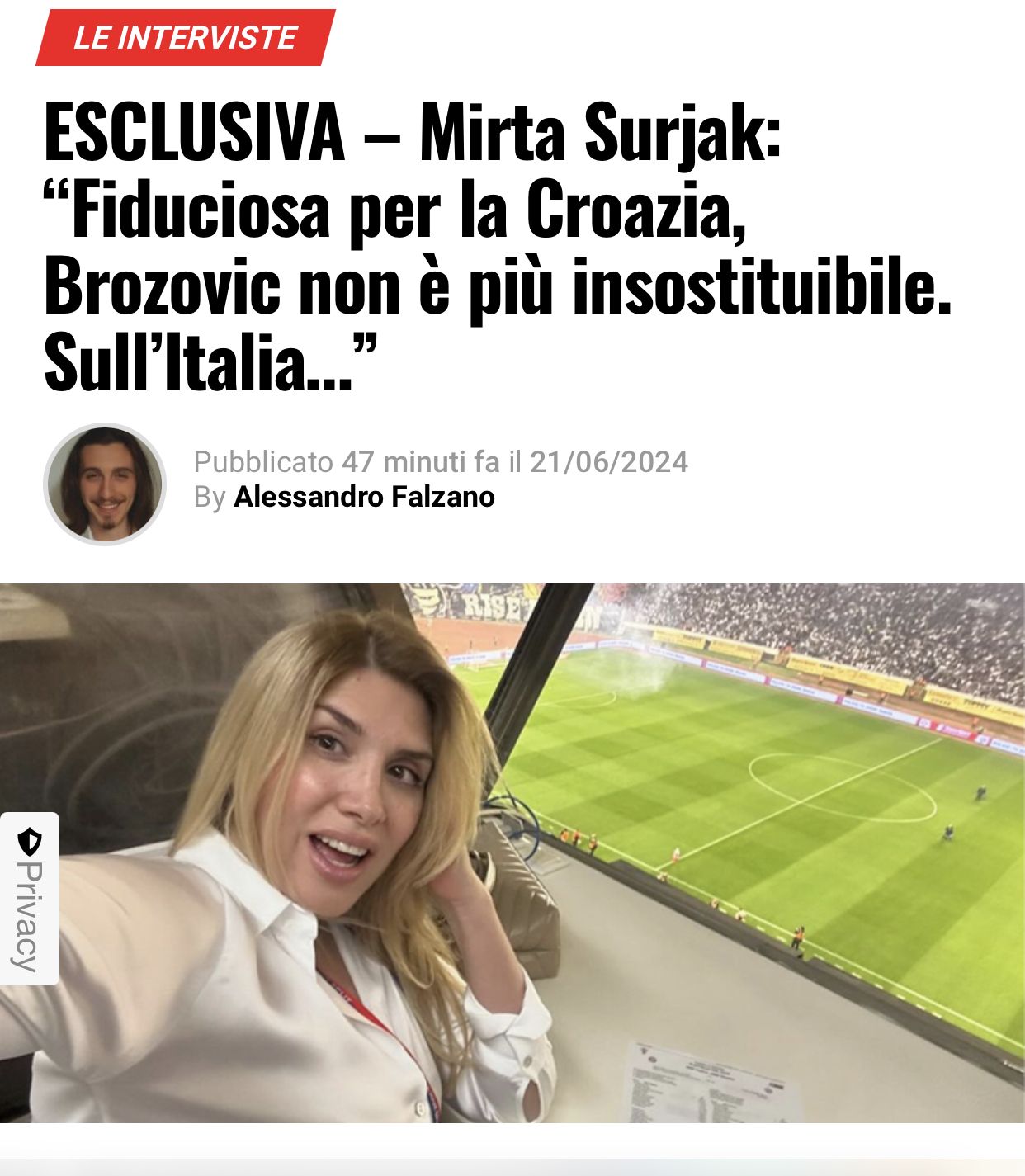 “Hrvatska se mora probuditi. To je dio našeg mentaliteta: mi smo borci, ratnici koji će umrijeti za svoje snove. Bit će mnogo promjena. Marcelo Brozović nažalost više ne igra na svojoj razini, vjerojatno je to zbog odlaska u Saudijsku Arabiju, a nadam se da će Dalić više prostora dati mladom Luki Sučiću, 21-godišnjaku iz Red Bull Salzburga. Optimistična sam, ali i ponosna na dosadašnji put. Naprijed Hrvatska!”, izmedju ostaloga je Talijanima izjavila Mirta Šurjak, a portal je još jednom objavio i spot “Mi manca il calcio u kojem i ona ima ulogu: