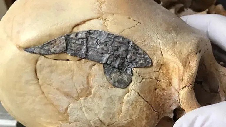 Uz ovaj potencijalni implantat, lubanja ima rupu ispod metala koja je vjerojatno nastala trepanacijom. Trepanacija, bušenje lubanje u pokušaju liječenja ozljede ili medicinskog stanja, bila je uobičajena praksa u starom svijetu.
