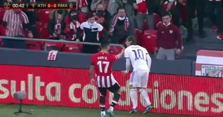 U 41. sekundi Modrić se borio za jednu loptu uz aut-crtu. Nije mogao stići loptu, a kad je to shvatio odlučio je napucati loptu prema tribinama. Nije pogodio navijače, ali jest vrh reklame koji odvaja tribine od terena. Navijači su poludjeli i skočili prema hrvatskom nogometašu, a čak se i branič Athletica Yuri Berchiche čudio njegovom potezu.
