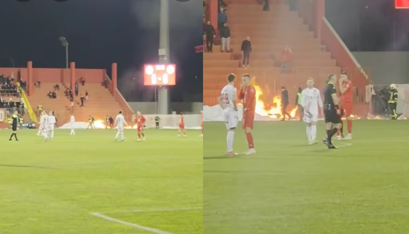 Ispred tribine domaćih navijača zapalile su se trake ubačene na teren. Vatra se proširila i stvorila opasnost, dok su igrači i stručni stožeri ostali zatečeni razvojem situacije. Na terenu je zavladala nevjerica dok se dim širio stadionom. Sudac je odmah prekinuo utakmicu, a na teren su ušli vatrogasci. Nakon nekoliko minuta uspjeli su staviti požar pod kontrolu i spriječiti širenje. Tijekom prijenosa vidjelo se da gore i kablovi iza gola Zrinjskog. Prema dostupnim informacijama, nema ozlijeđenih ni veće štete. Nakon intervencije i smirivanja situacije, susret je nastavljen u 19. minuti.