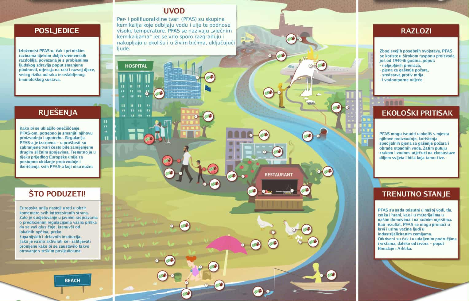 U Belgiji, zbog kontaminacije PFAS-om u Zwijndrechtu, država je morala obustaviti gradnju infrastrukture, a stanovnicima je preporučeno čak da ne jedu hranu iz vlastitih vrtova. U Danskoj je PFAS otkriven čak i u majcinom mlijeku. Blizu nas, u Sjeveroistočnoj Italiji se desio najveći PFAS leak u Europi pred desetak godina. SAD su već uvele stroge limite u pitkoj vodi – granica za neke PFAS tvari spuštena je na gotovo nemjerljive razine. Poslije ovih većih skandala, zemlje Zapadne Europe kontinuirano mjere PFAS i mkroplastike u vodi i zemlji u većini svojih regija.