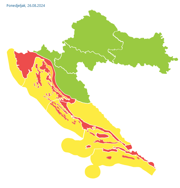 Već u ranim jutarnjim satima, Dubrovnik je zabilježio visoku temperaturu od preko 31°C, a tijekom dana očekuje se da će temperature narasti iznad 35°C. Prema podacima Državnog hidrometeorološkog zavoda (DHMZ), za cijelu obalu izdano je crveno upozorenje Meteoalarma zbog opasnosti od toplinskih valova. Iako će sutra upozorenje biti sniženo na žuto, od srijede se očekuje povlačenje opasnosti od toplinskog vala.