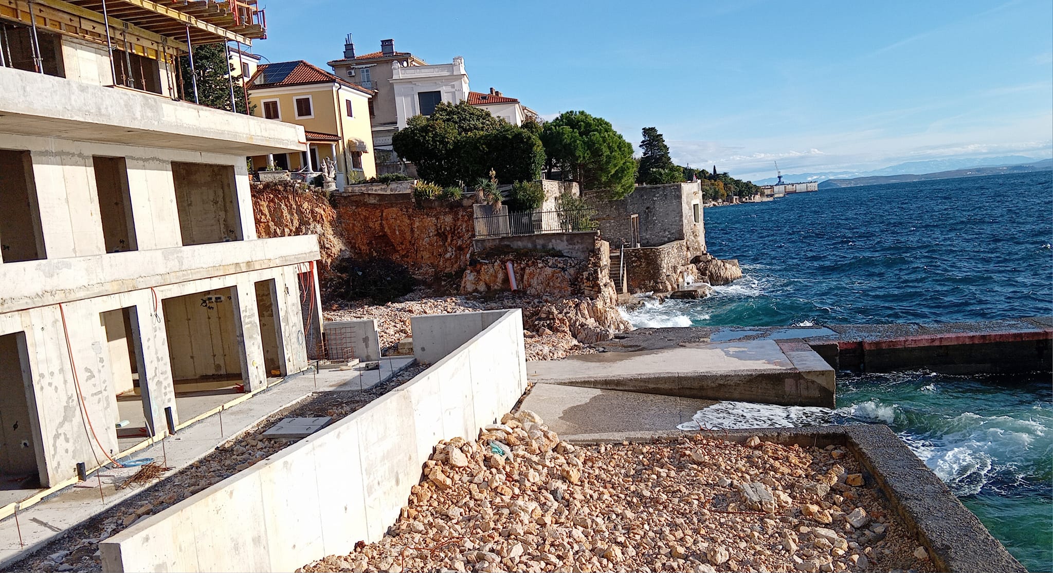 Na Pećinama, tik uz samu obalu mora, već duže vrijeme traje gradnja stambene zgrade koja izaziva brojne kontroverze i zabrinutost među građanima. Tijekom iskopavanja temelja za ovu zgradu, suočili su se s ozbiljnim problemom – nadiranje morske vode, koju su ispumpavali mjesecima. Okolne zgrade, sagrađene na stijenama iznad razine mora, nisu imale takvih poteškoća, no građani se sada pitaju: što će biti s ovom novom građevinom kada se razina mora počne dizati?