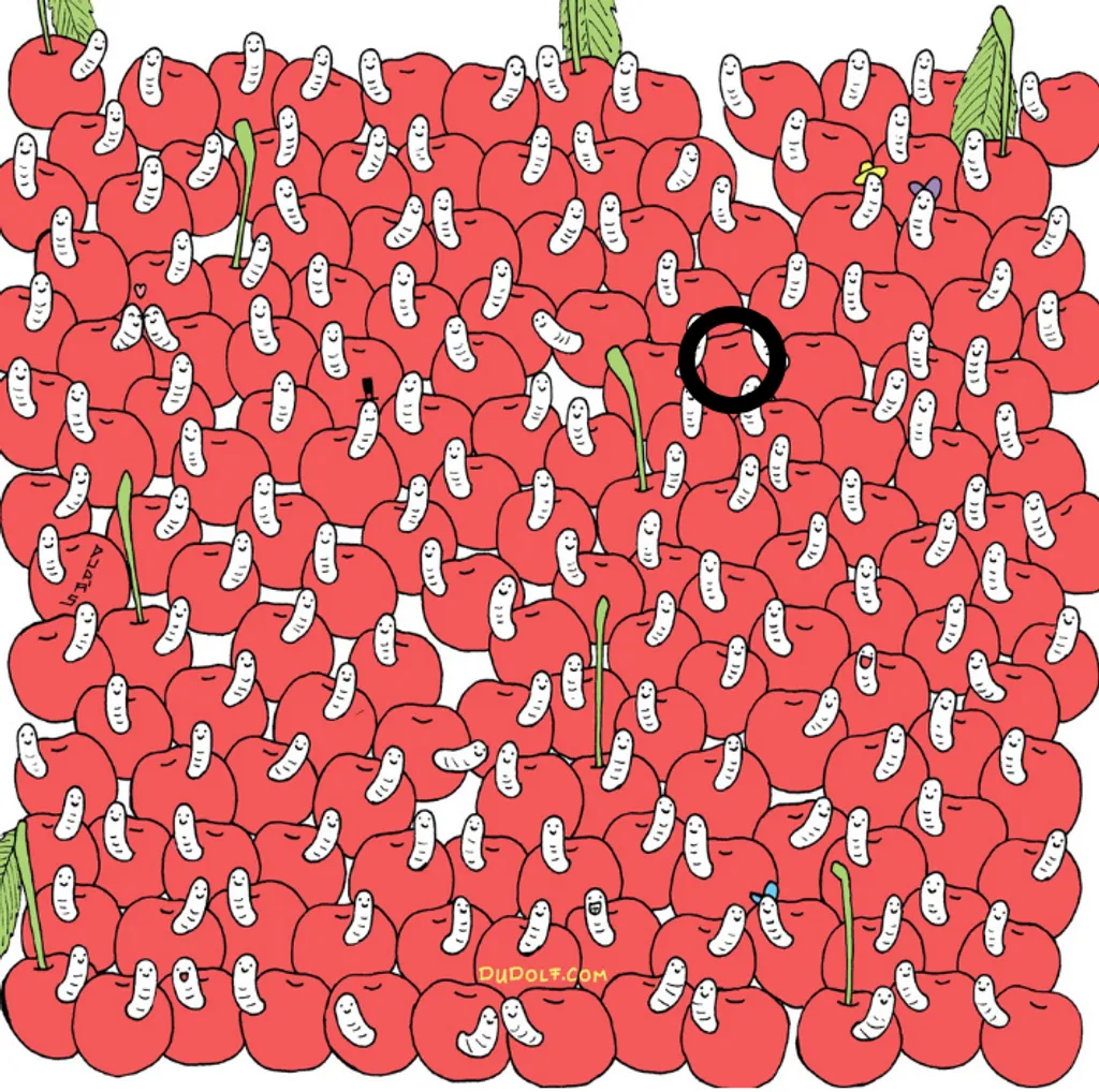 Na prvi pogled, riječ je o simpatičnoj i šarenoj ilustraciji s desecima trešanja. Svaka od njih ima crvića – neki su nasmiješeni, neki imaju šeširiće, a neki su jednostavno “goli”. No, među njima se krije jedna trešnja koja nema apsolutno nikakvog crvića, i upravo ona je “uljez” kojeg treba pronaći.